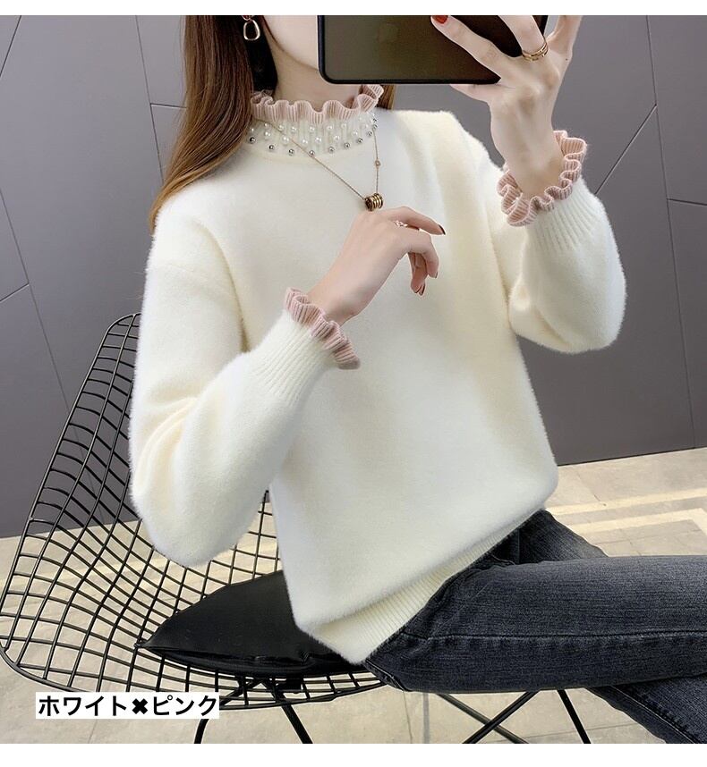 トップス レディース ニット ショート丈 長袖 無地 春 秋 冬 セミフレア フリル かわいい 大人可愛い きれいめ シンプル カジュアル 大人 上品 おしゃれ お洒落 かっこいい レトロ 大人可愛い 大人女子 ガーリー ルーズ ハイネック 袖あり 白 ホワイト 青 ブルー ベージュ くすみカラー S M L XL 2XL 20代 30代 オフィス 学生 デート お出かけ 女子会 休日 着回し 普段使い 韓国 韓国系 オルチャン ファッション スタイル モテ 送料無料 トレンド 流行 インスタ映え | Rena 韓国ファッション レディースアパレル
