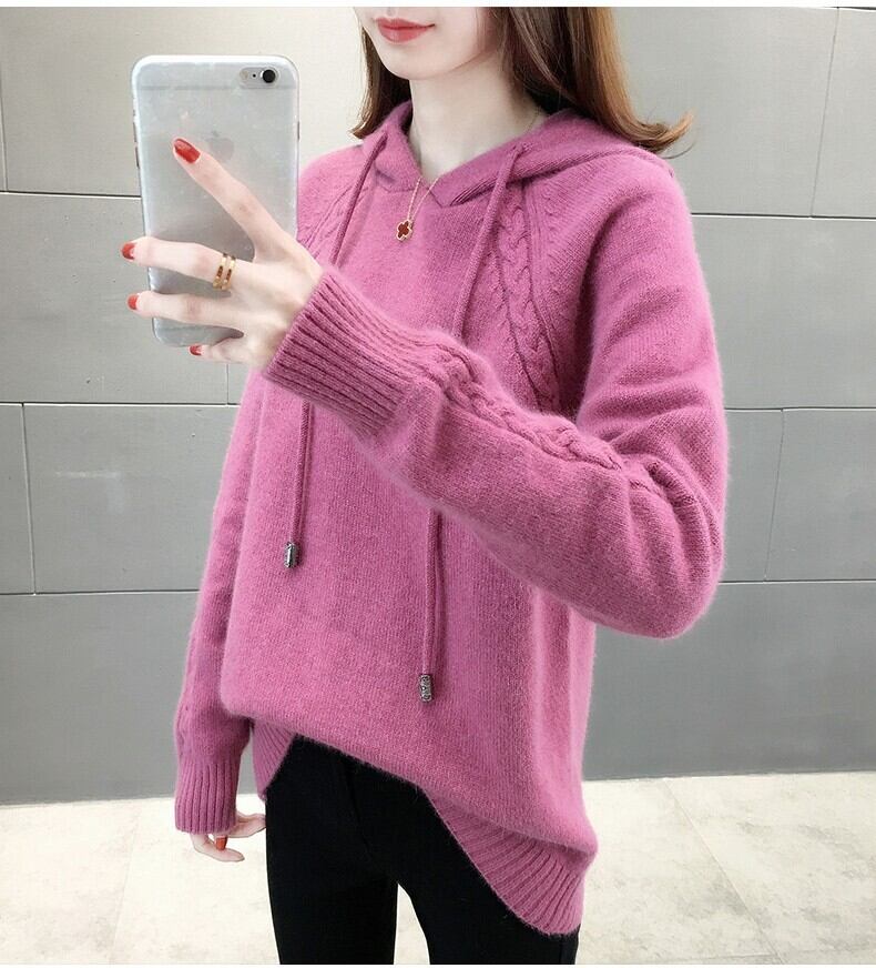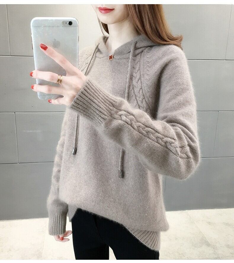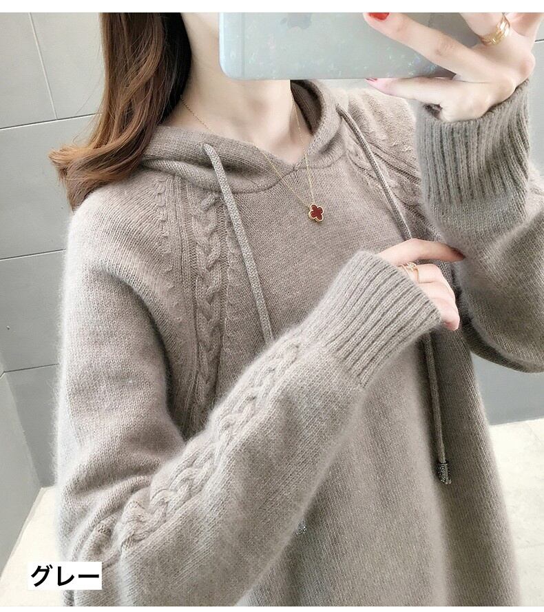 ゆったりと着こなせる、おしゃれなフード付きニットです。