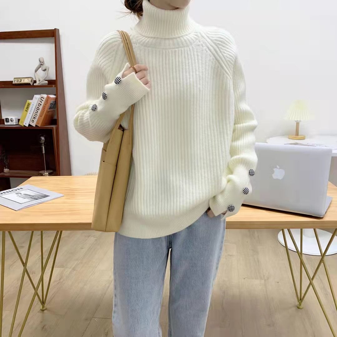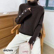袖のボタンが可愛らしさにワンポイント添えてくれるおしゃれなタートルニットセーターです。