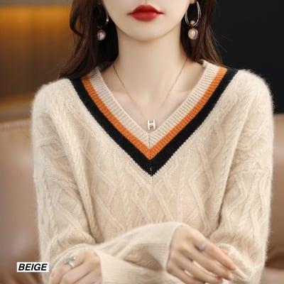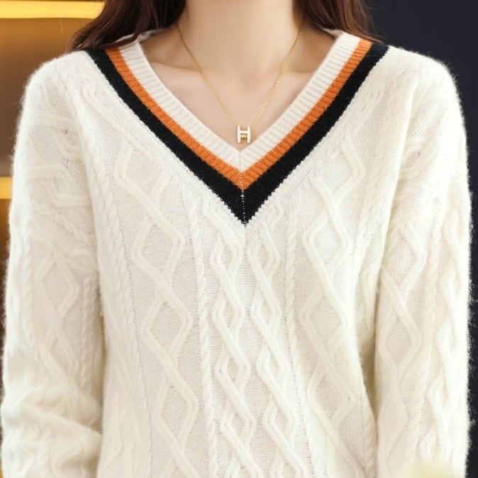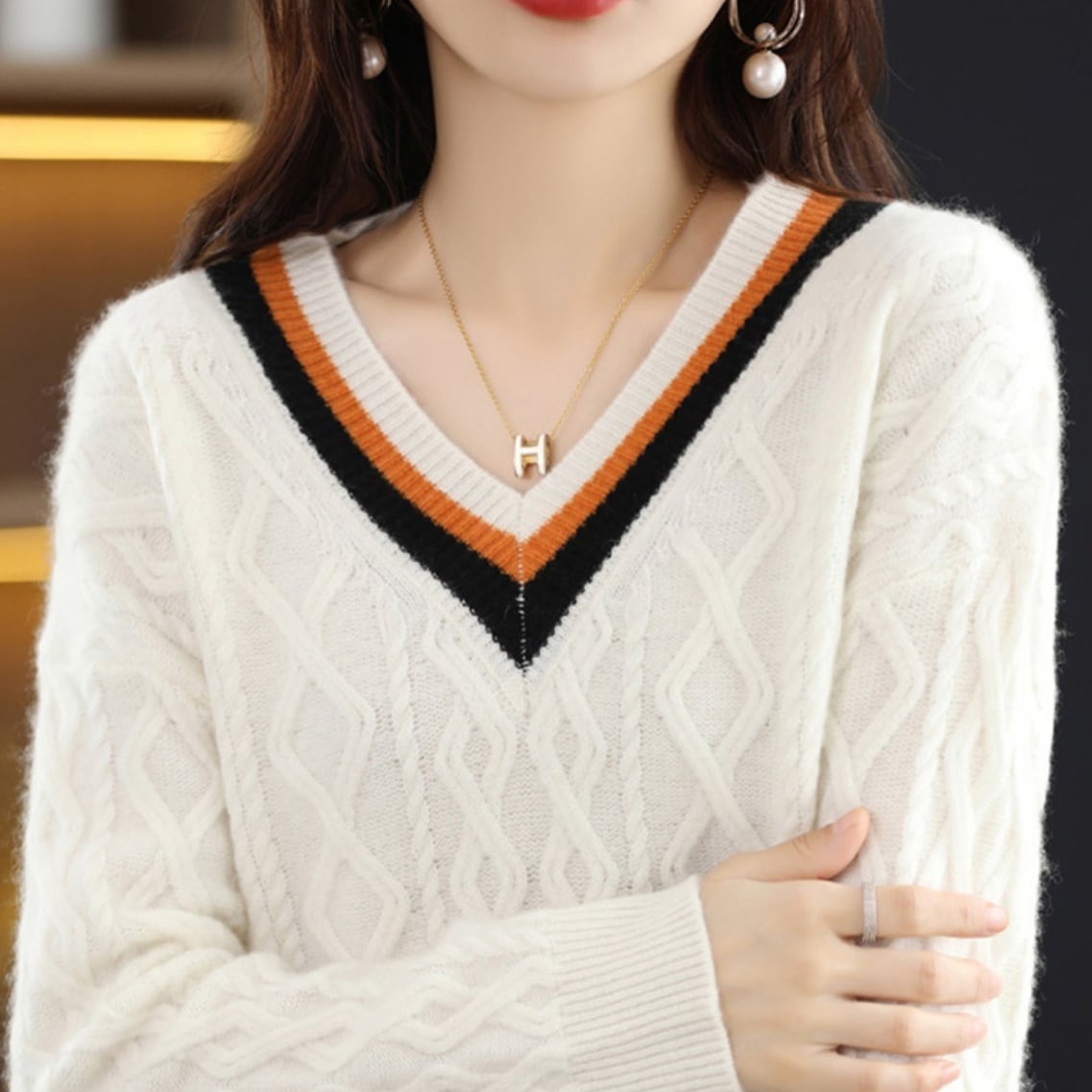 Vネックのデザインで首まわりをスッキリときれいに見せる、デザインセーターです。