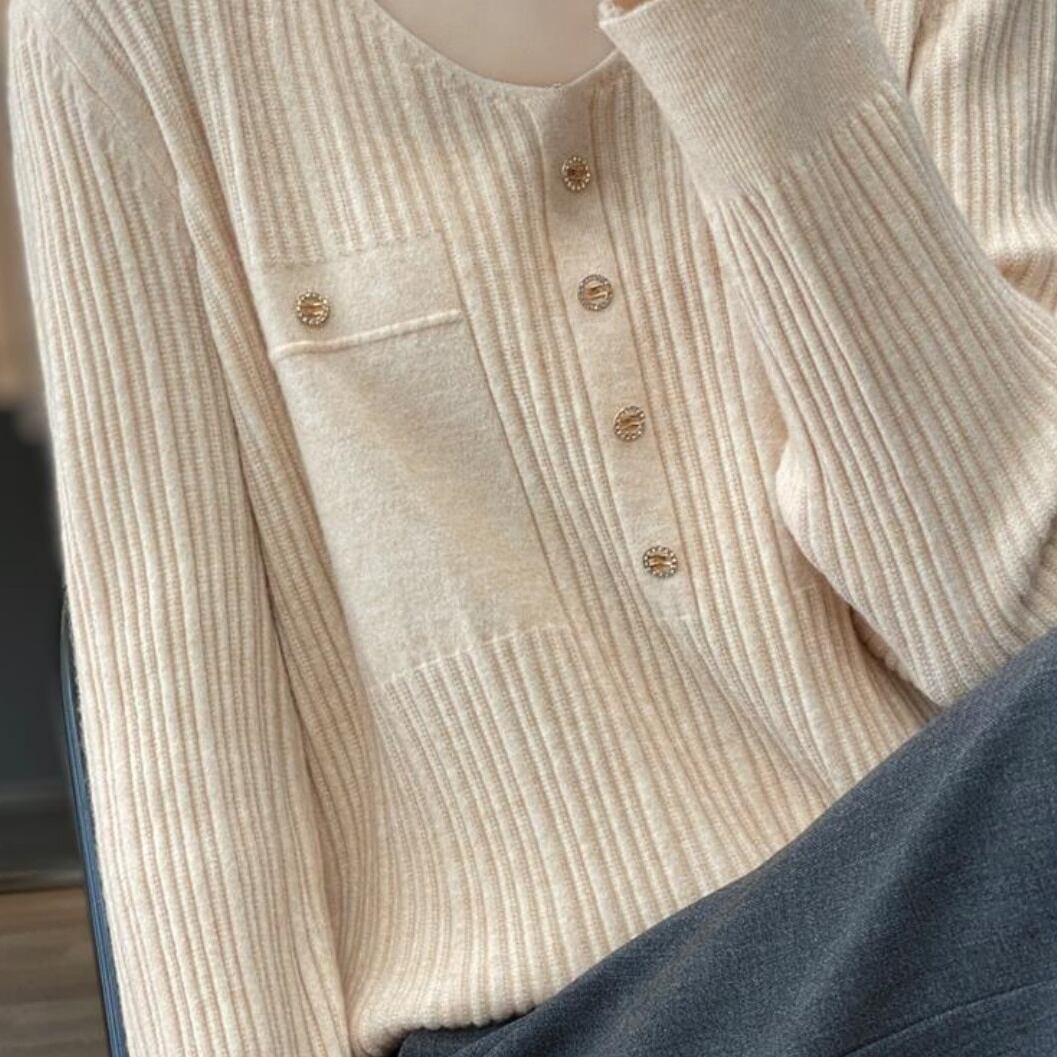 胸元にキラリと光るボタンが可愛らしく、また高見えもしてくれる特徴的なデザインです。
