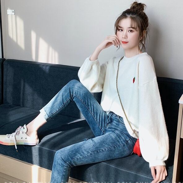 シンプルでありながら、フルーツ柄のワンポイントが可愛いセーター。