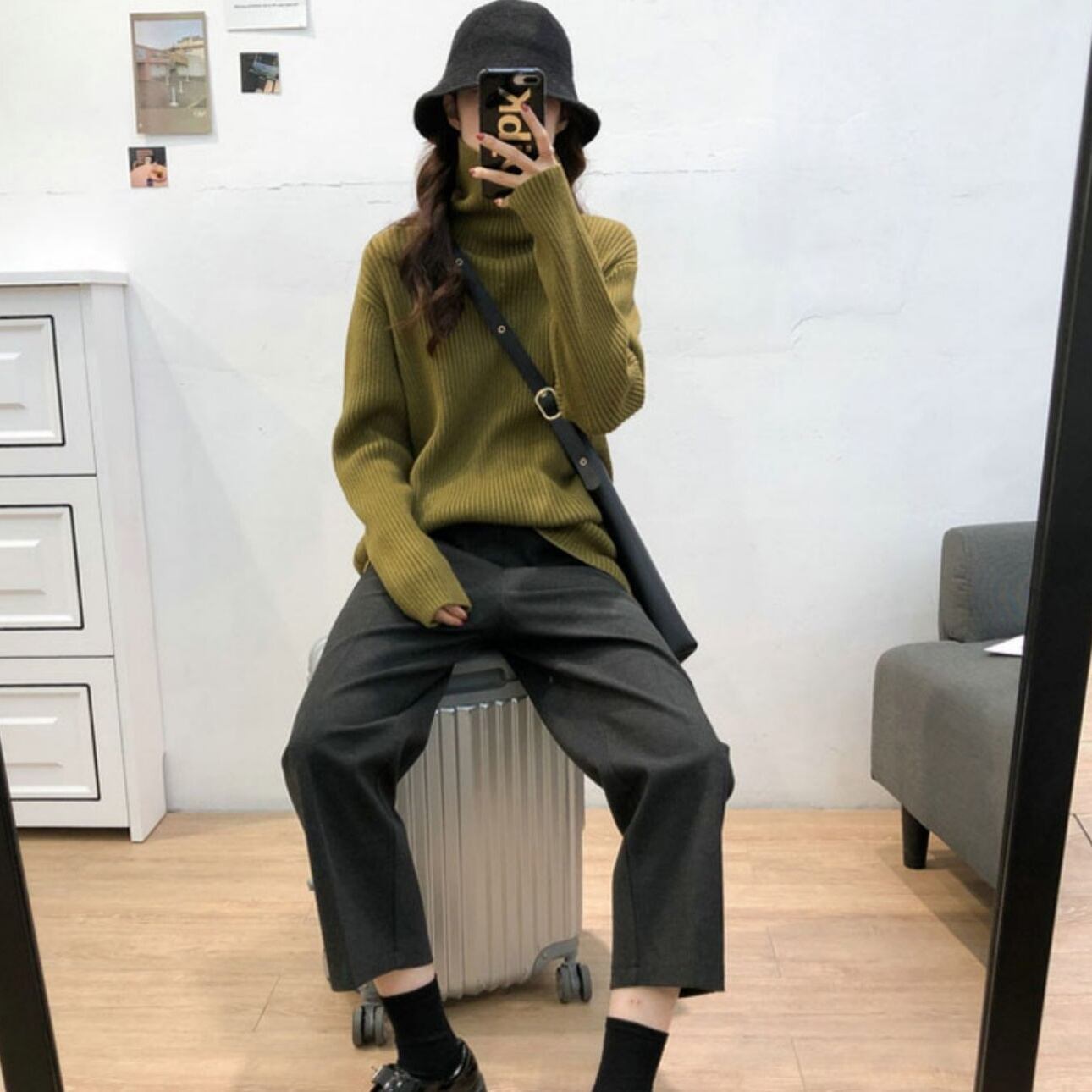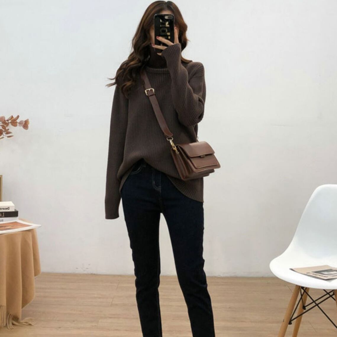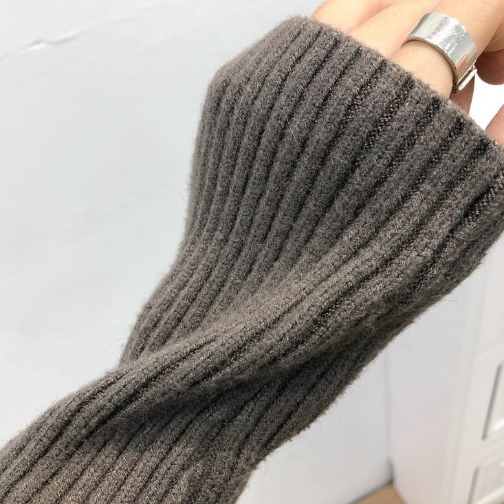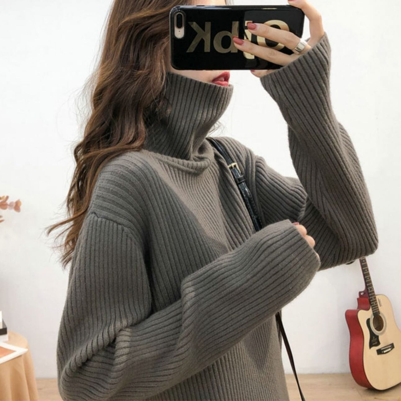 暖かなニット素材と心地よいリブ入りが魅力のハイネックトップス。