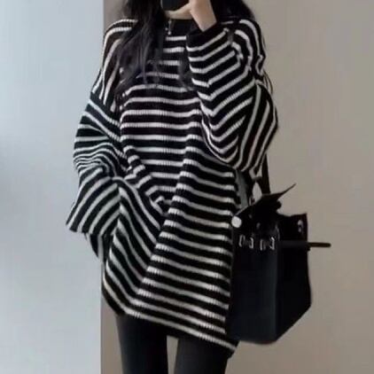 大人っぽい魅力漂うモノトーンのボーダーニットワンピース。