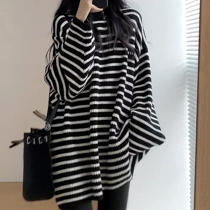 トップス レディース ニット ロング丈 長袖 ボーダー 春 秋 冬 セミフレア かわいい 大人可愛い きれいめ シンプル カジュアル 大人 上品 おしゃれ お洒落 レトロ アジアン 大人可愛い 大人女子 こなれ感 個性的 セクシー とろみ感 抜け感 ハイネック ロング 袖あり 白 ホワイト 黒 ブラック 大人カラー M L XL 2XL 20代 30代 デート お出かけ 女子会 休日 アウトドア オールシーズン 着回し 普段使い オルチャン コーデ スタイル モテ 送料無料 トレンド 流行 インスタ映え | Rena 韓国ファッション レディースアパレル