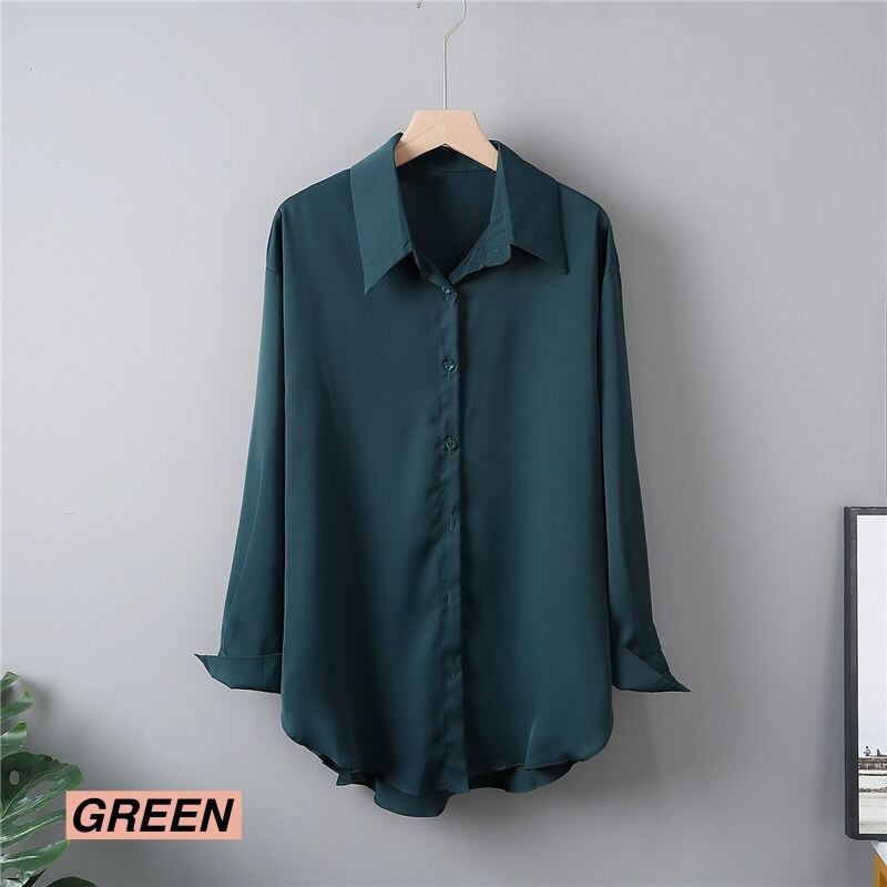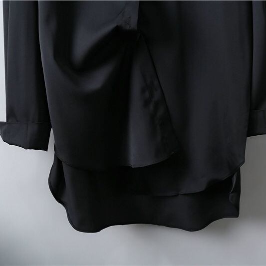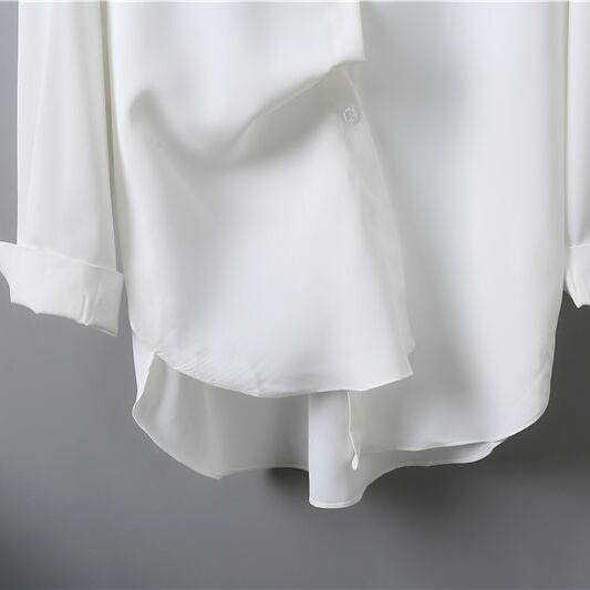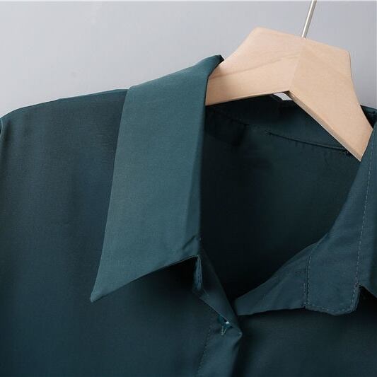 シフォンブラウスは高級感漂う素材で、襟付きの上品さが際立ちます。