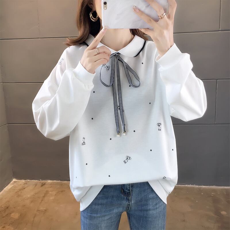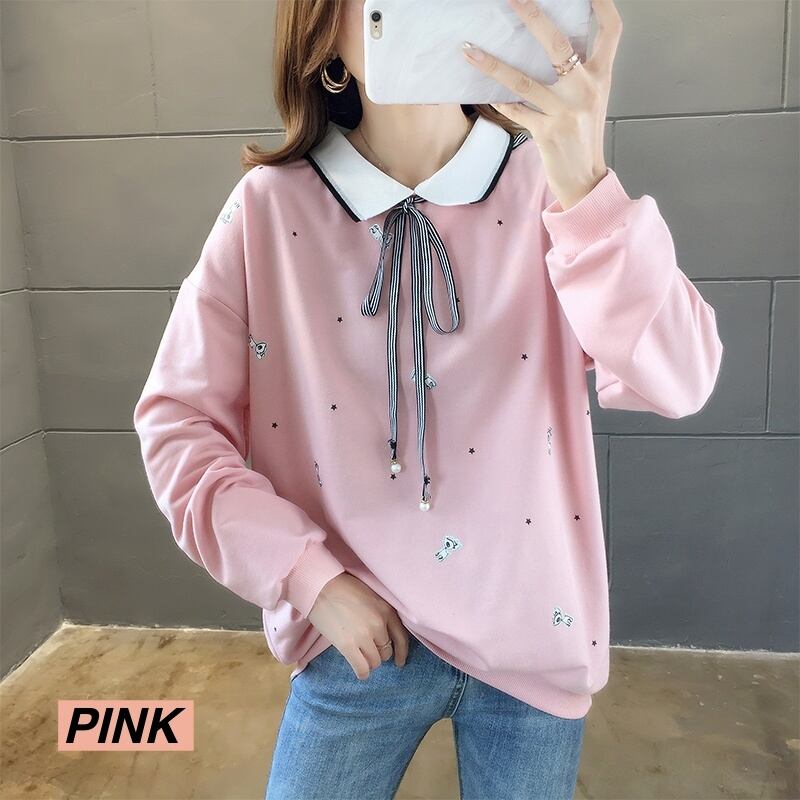 トップス レディース カットソー ショート丈 長袖 柄 春 秋 冬 セミフレア リボン かわいい 大人可愛い きれいめ シンプル カジュアル 大人 上品 おしゃれ お洒落 レトロ エキゾチック 大人可愛い 大人女子 こなれ感 個性的 セクシー 存在感 とろみ感 抜け感 襟付き ショート 袖あり 白 ホワイト 青 ブルー ピンク くすみカラー M L XL 2XL 3XL 20代 30代 デート お出かけ 女子会 休日 着回し 普段使い オルチャン コーデ スタイル 送料無料 トレンド 流行 インスタ映え | Rena 韓国ファッション レディースアパレル