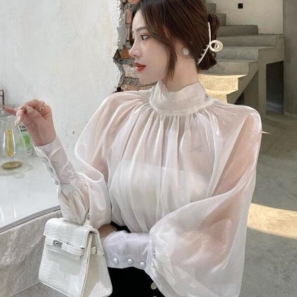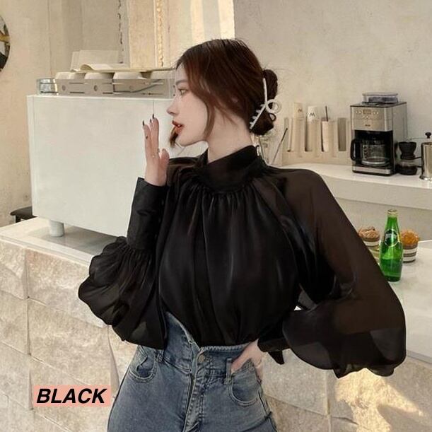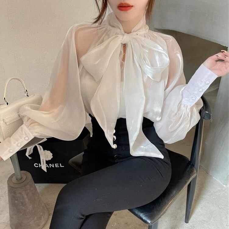 ファッショナブルなデザインと女性らしいパフスリーブが特徴のルーズリボンシャツです。