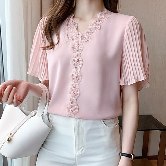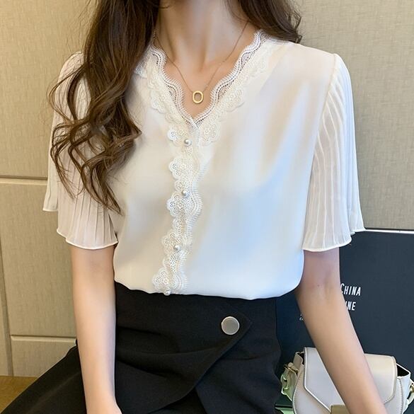 トップス レディース ブラウス ショート丈 半袖 無地 春 秋 冬 セミフレア かわいい 大人可愛い きれいめ シンプル カジュアル 大人 上品 おしゃれ お洒落 レトロ エキゾチック 大人可愛い 大人女子 こなれ感 個性的 セクシー 存在感 とろみ感 抜け感 Vネック 袖あり 白 ホワイト ピンク くすみカラー S M L XL 2XL 20代 30代 デート お出かけ 女子会 休日 着回し 普段使い 韓国系 オルチャン コーデ スタイル モテ 送料無料 トレンド 流行 インスタ映え | Rena 韓国ファッション レディースアパレル