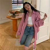 トップス レディース シャツ ロング丈 長袖 ストライプ 春 秋 冬 セミフレア かわいい 大人可愛い きれいめ シンプル カジュアル 大人 上品 おしゃれ お洒落 レトロ 大人可愛い 大人女子 こなれ感 キュート ガーリー 個性的 セクシー 存在感 とろみ感 Vネック 袖あり 緑 グリーン ピンク 大人カラー S M L XL 20代 30代 デート お出かけ 女子会 休日 イベント 着回し 普段使い オルチャン スタイル 楽ちん モテ 送料無料 トレンド 流行 インスタ映え | Rena 韓国ファッション レディースアパレル