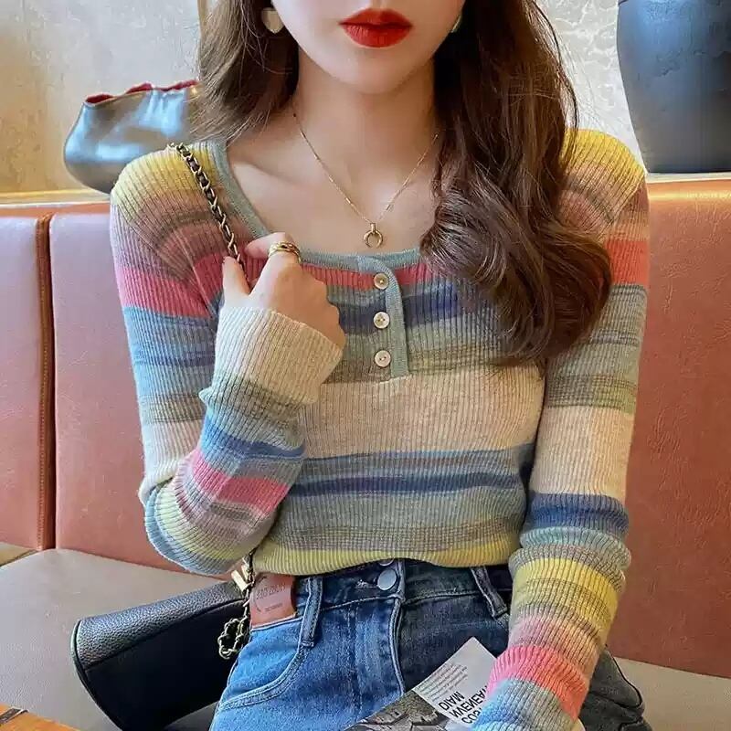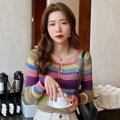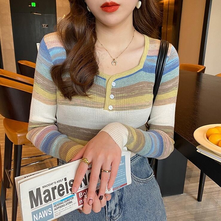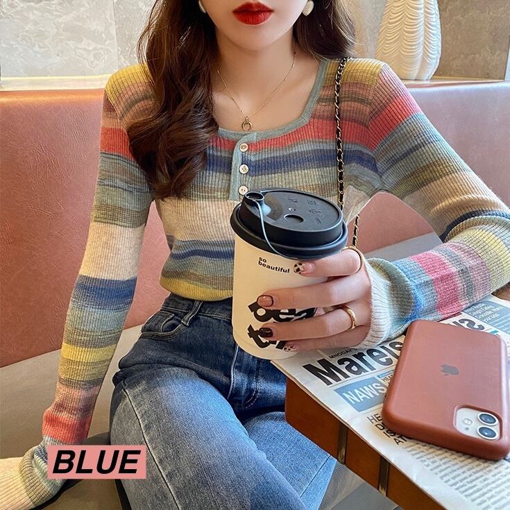 レインボーストライプニットは薄手でありながらファッショナブルなデザインが魅力です。