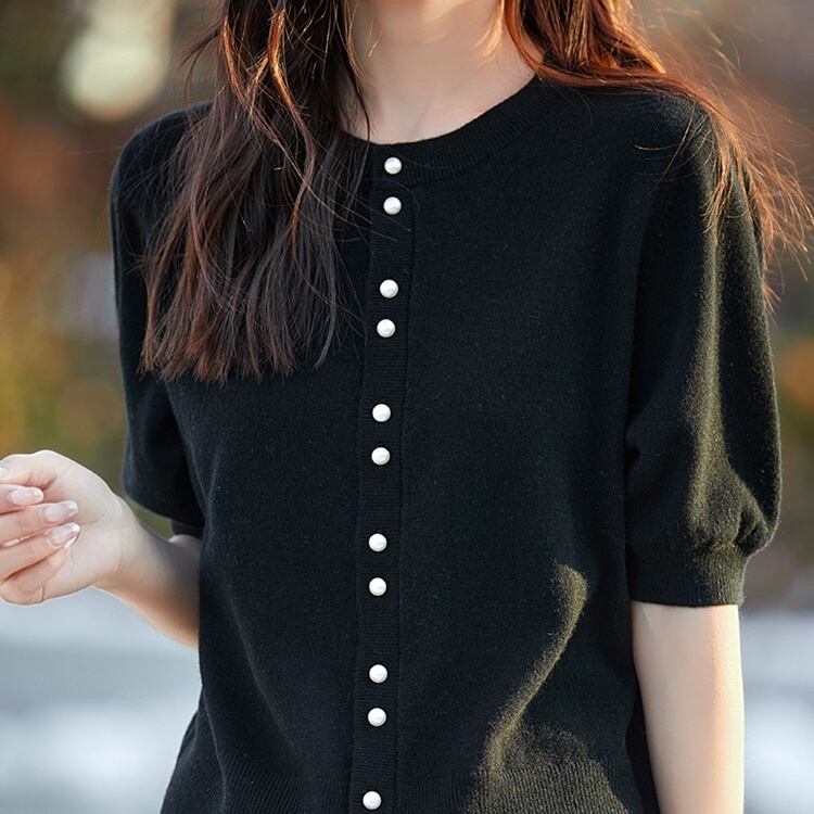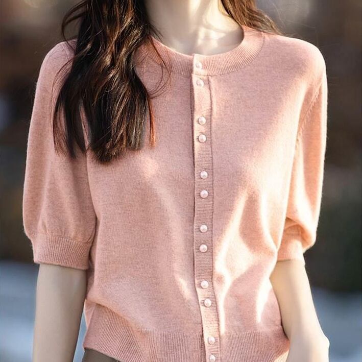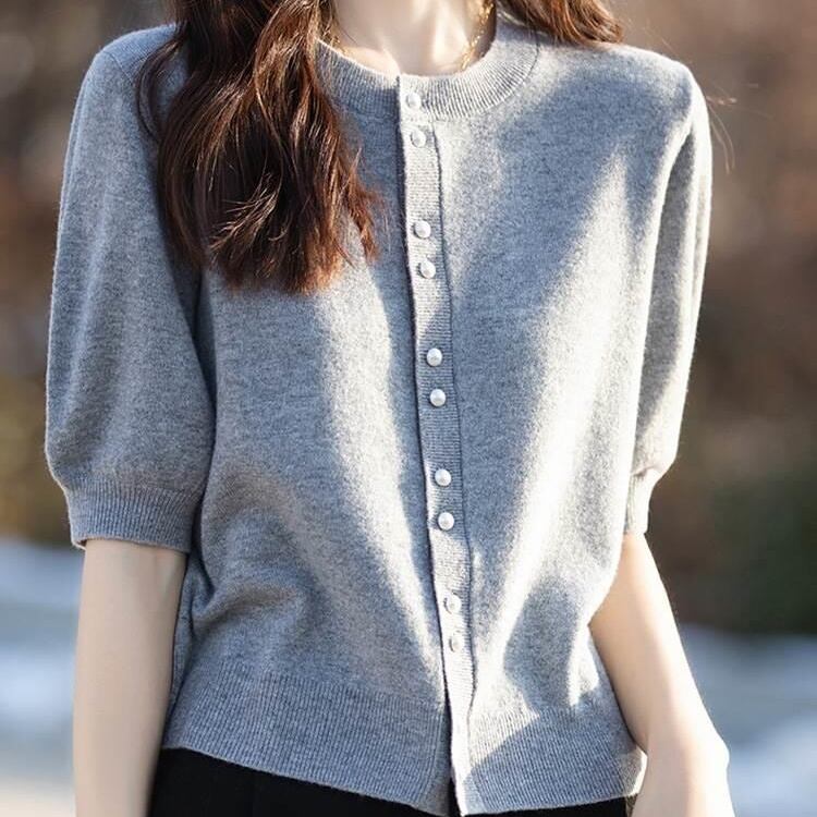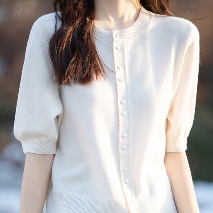 パフスリーブがかわいらしさを引き立て、ふんわりとしたシルエットで安心感のある着こなしが楽しめる5分袖カーディガンです。