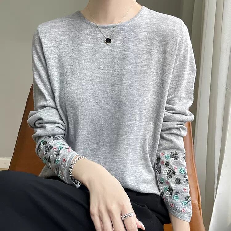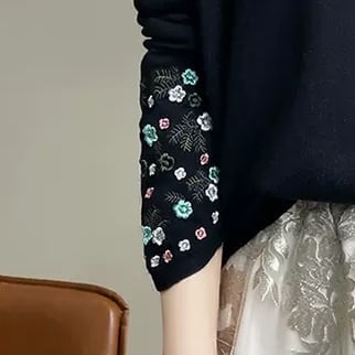 このトップスはデザイン性が高く、袖の刺繍が華やかでおしゃれなアクセント。